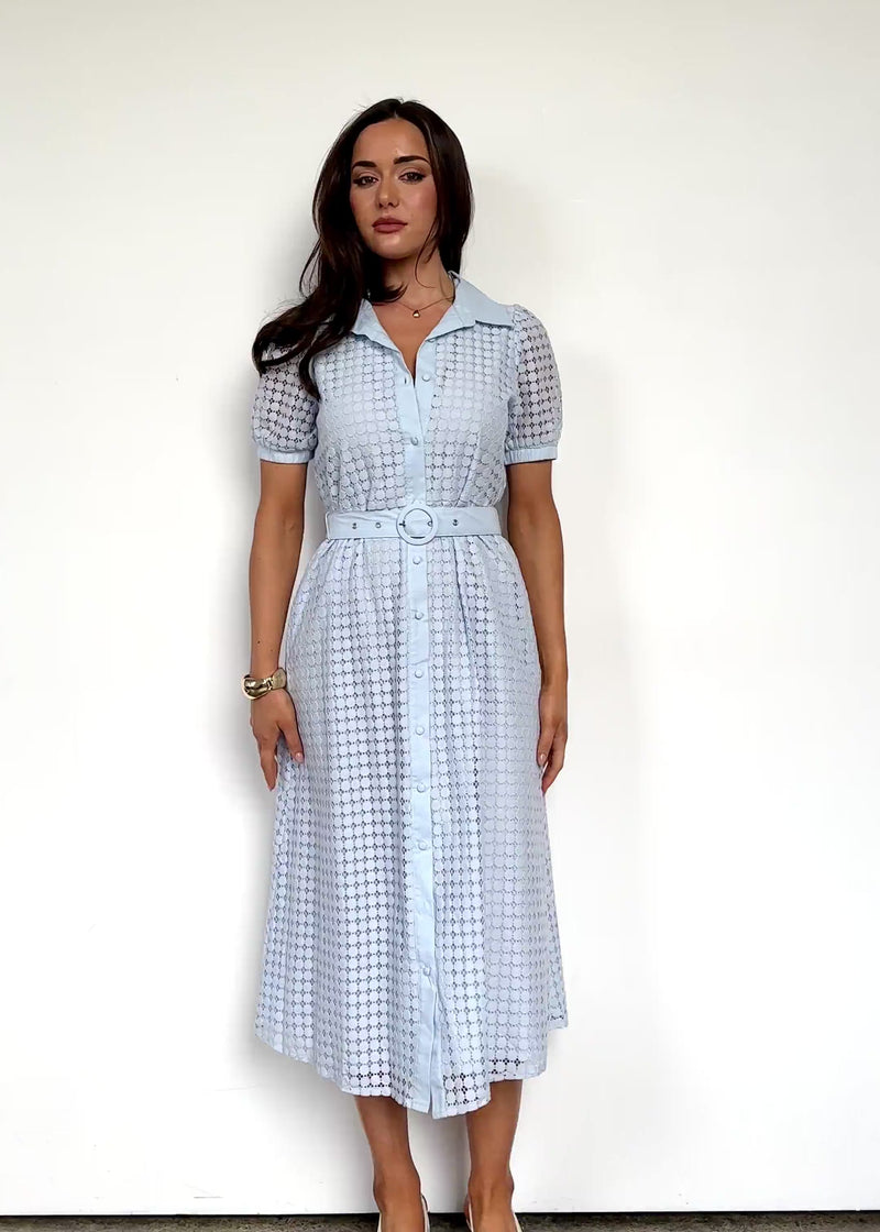 Bring a soft yet striking vibe with the Hilton Midi Dress in blue – ideal for coastal dinners, spring weddings, or daytime events. Pair it with nude sandals and a crossbody for laid-back charm, or dress it up with silver heels and pearl accessories.