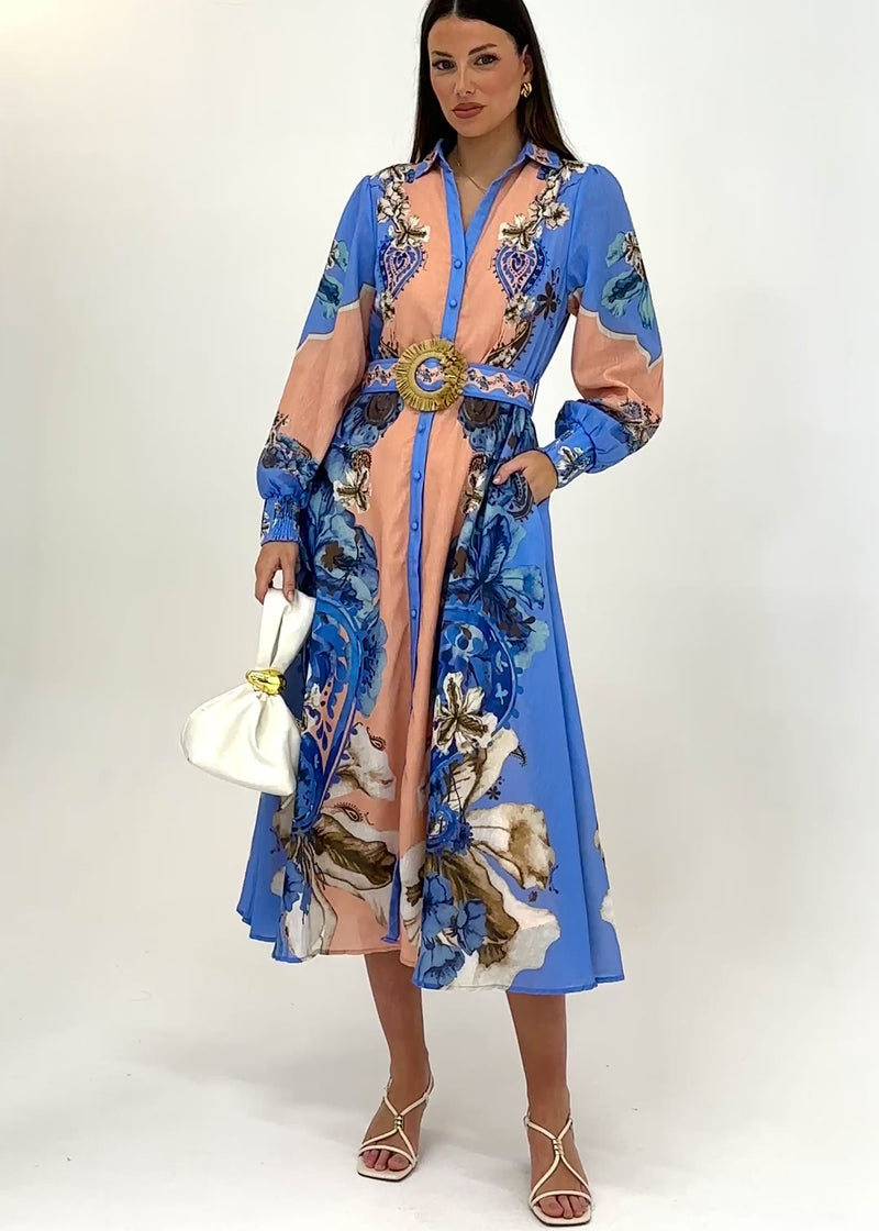 Soft hues and a flattering cut make the Huntington Midi Dress in Blue Willow a standout for brunches and baby showers. Pair it with nude strappy heels, a shoulder bag, and dainty pearl earrings for an effortlessly polished look.