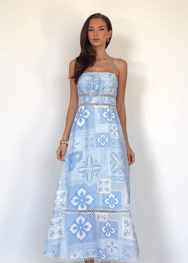 Steal the spotlight in the Indie Maxi Dress - Blue Geo. Designed with criss-cross details and sheer accents for just the right amount of flirt. Pair with wedges and a clutch for sunset dinners or resort nights. Click to shop this vacay-ready fave now!
