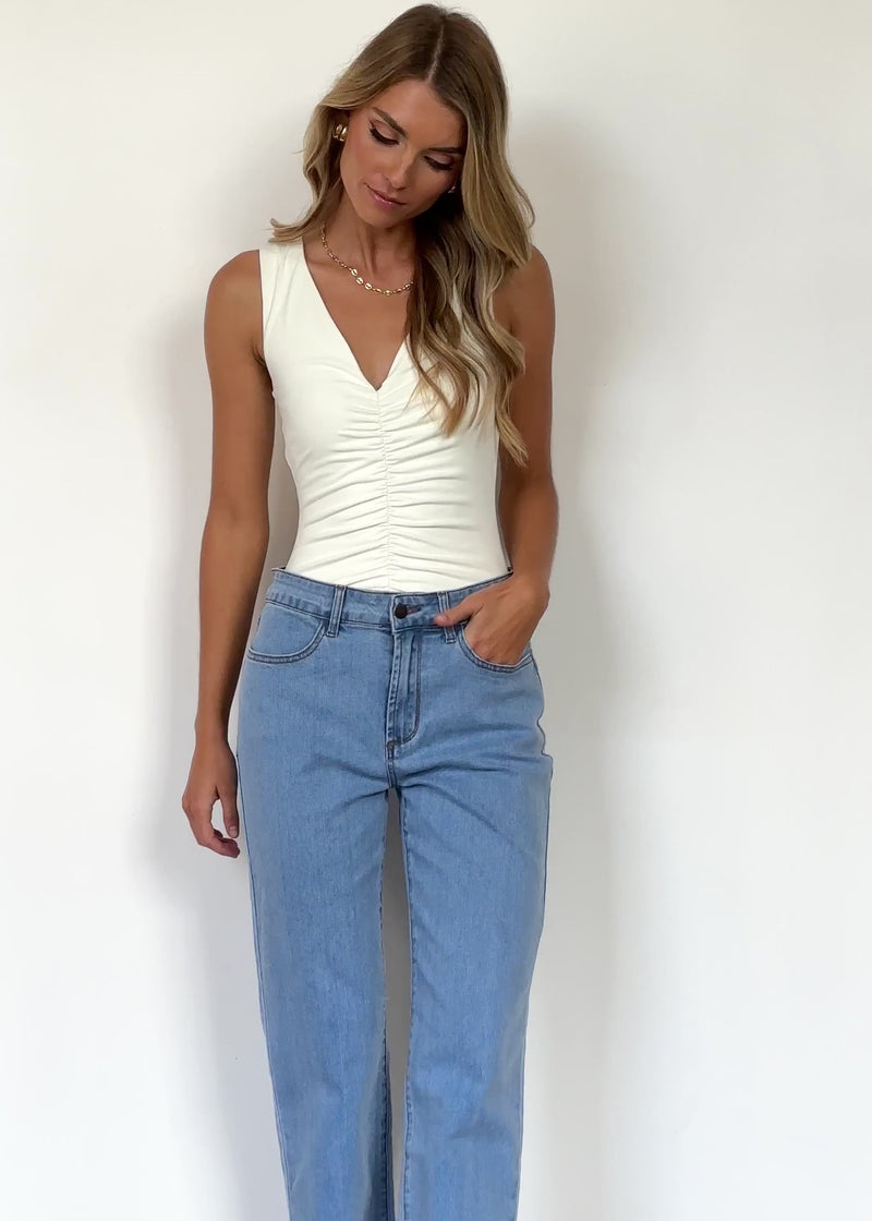 Perfect for everyday wear, the Isobel Stretch Jeans in Light Blue combine comfort and style with their flattering fit. Pair them with a relaxed knit top, loose waves, and classic trainers for an effortlessly cool look. A mini shoulder bag adds a chic touch to complete the outfit.