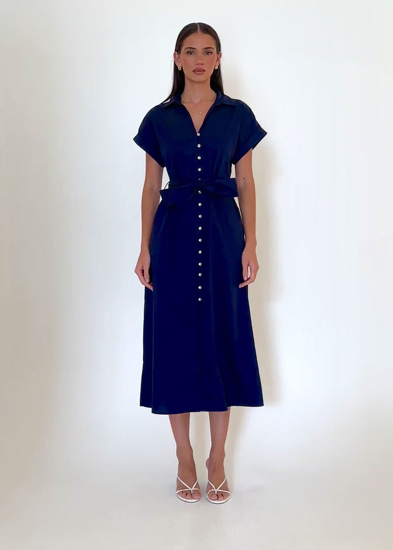 Achieve a classic aesthetic wearing Joanna Midi Dress - Navy for a polished office-to-dinner transition. A deep navy shade and modest midi length ensure a sophisticated look that remains comfortable throughout a busy day. Match this versatile dress with pointed-toe pumps and a sleek leather handbag to master the art of understated elegance.
