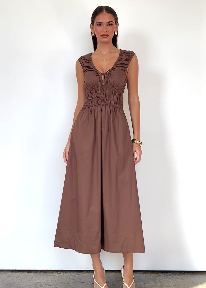 Rich tones and clean lines make the Kamilie Midi Dress in Chocolate ideal for dinners, work events, and evenings out. Style with gold jewellery, heels, and a sleek clutch. A chocolate midi dress that delivers understated sophistication.