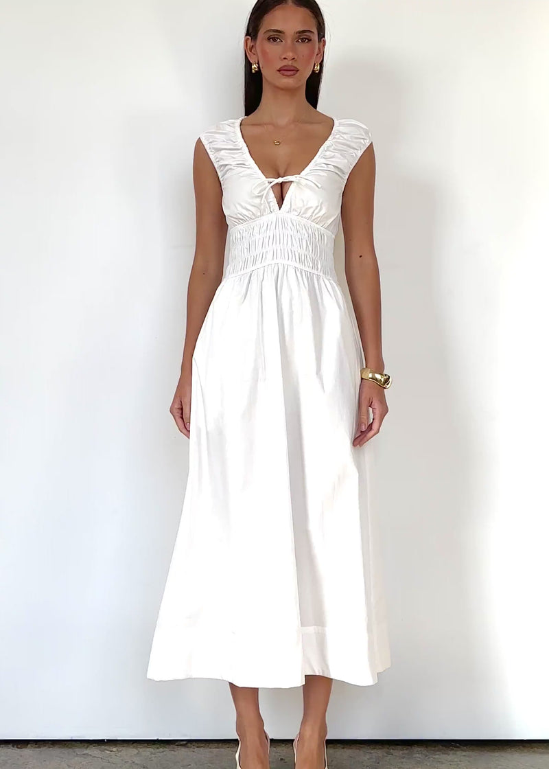 Timeless elegance defines the Kamilie Midi Dress in White. Perfect for brunches, bridal events, and celebrations, pair with nude heels, delicate jewellery, and a structured bag. This white midi dress offers polished charm that works beautifully day to night.