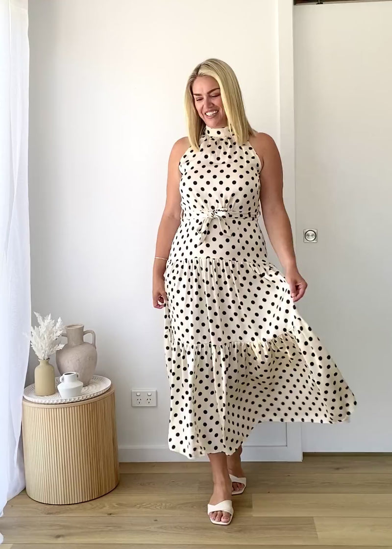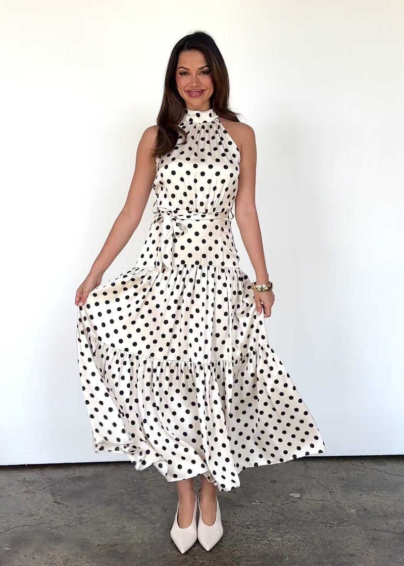 Soft, playful, and ultra-flattering, the Katrina Maxi in cream polka brings retro charm to your wardrobe. Pair with tan heels and gold accessories for a chic day-to-night look.
