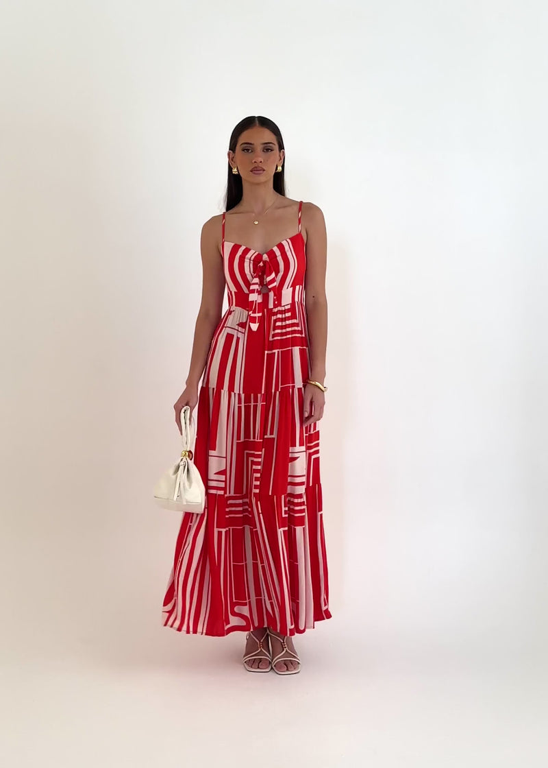 Make a bold entrance in the Kealey Maxi Dress with its striking red abstract print. Effortless yet eye-catching, this maxi shines with gold hoops and sandals for day plans, or with sleek heels for evening events.