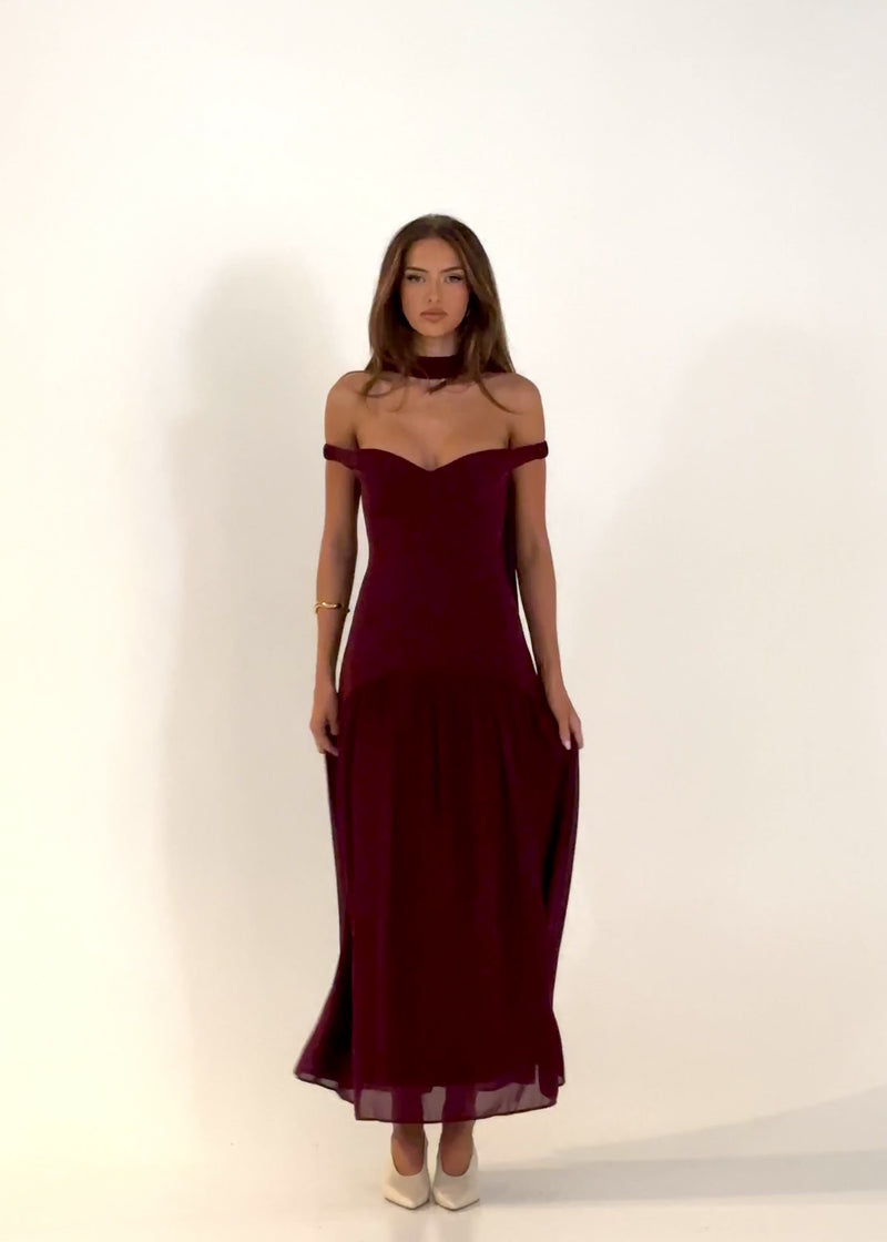 Chic and sophisticated, the Kirah Off Shoulder Maxi Dress in Wine is designed to turn heads. The rich hue and elegant draping make it perfect for evening events. Pair it with strappy heels and a sleek clutch for an effortless statement.