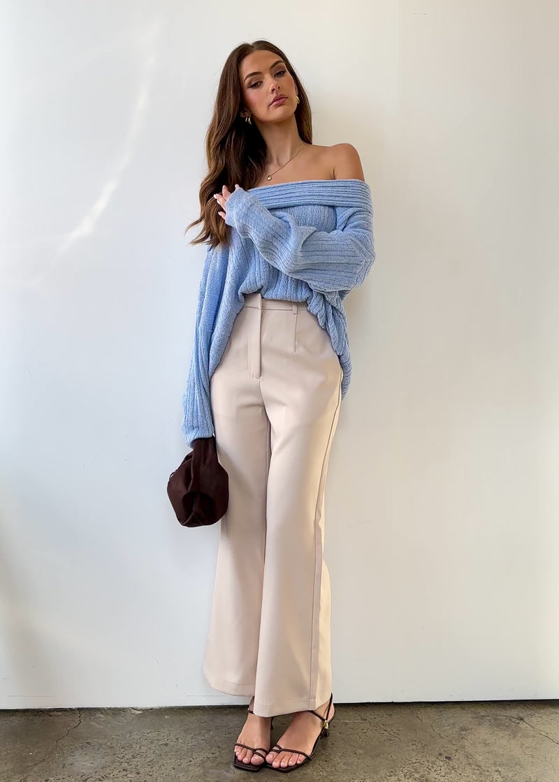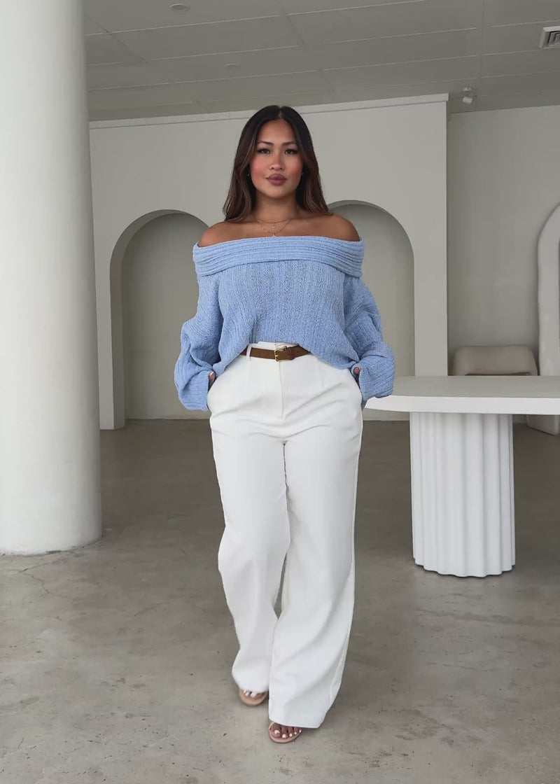 Knoxville Off Shoulder Sweater in Blue brings a relaxed vibe with its slouchy neckline and comfy fit. Style it with wide leg jeans and chunky boots for an easy, off-duty look.