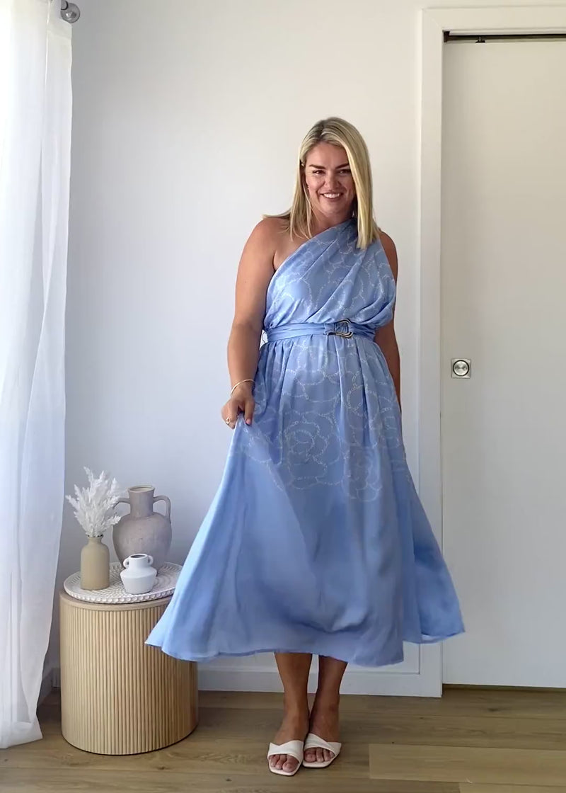 Cocktail season calls for the Korah One Shoulder Midi Dress - Blue Abstract. Team with block heels, a clutch, and statement earrings for night outs or weddings. Perfect spring/summer glam.
