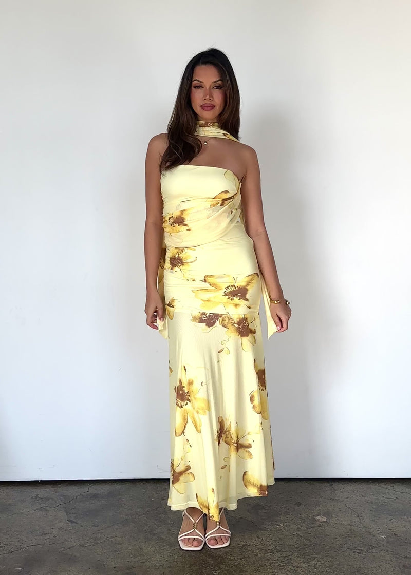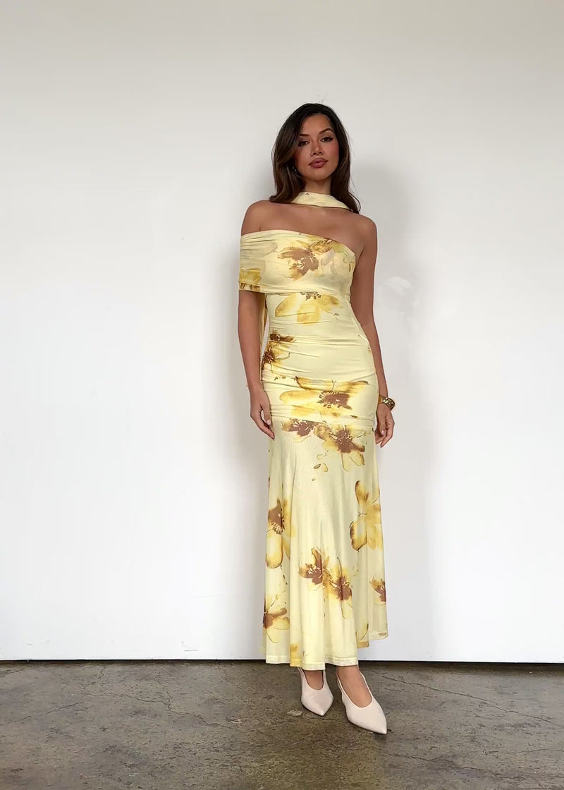 Fresh and fun, the Lena Maxi in lemon floral brings a soft pop of colour to your day. Its flowy mesh design moves beautifully, making it perfect for daytime events. Style with white sandals and a crossbody bag.