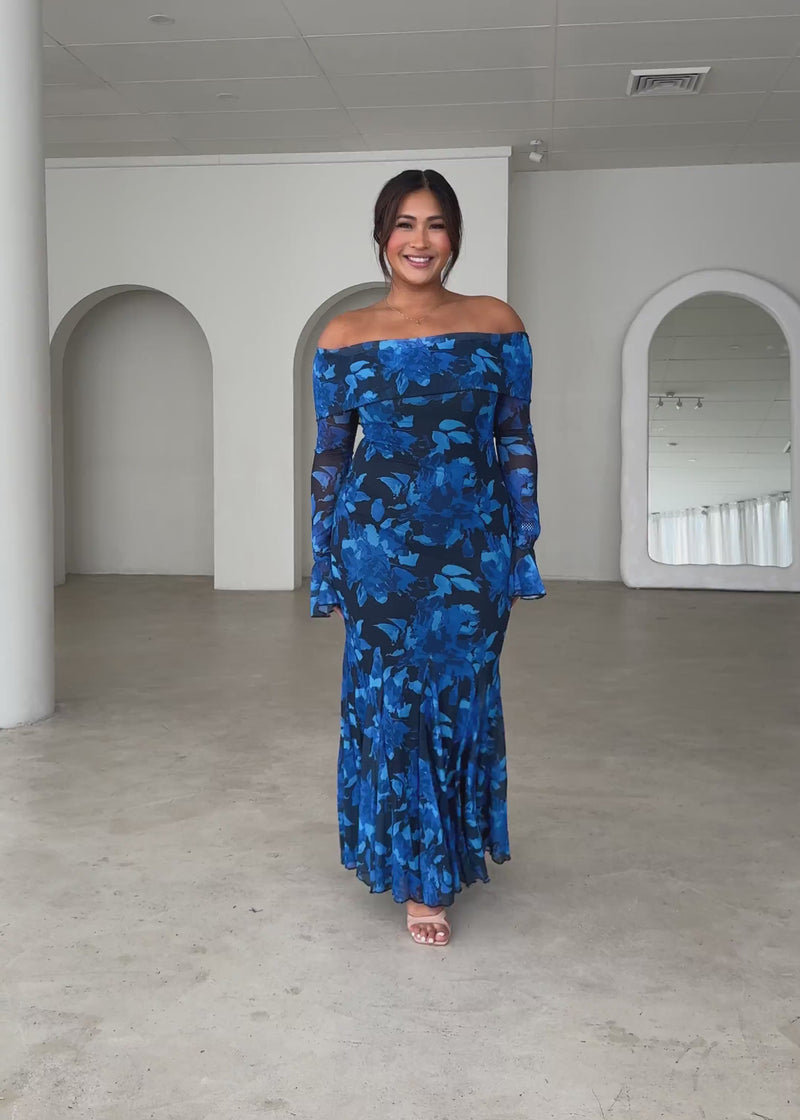 Romantic and ethereal, the Linier Off Shoulder Mesh Maxi Dress in Blue Floral is a dreamy addition to any wardrobe. The soft mesh overlay and delicate floral print exude femininity, while the off-shoulder design adds a touch of allure. Pair it with dainty jewelry and soft waves for a whimsical finish.