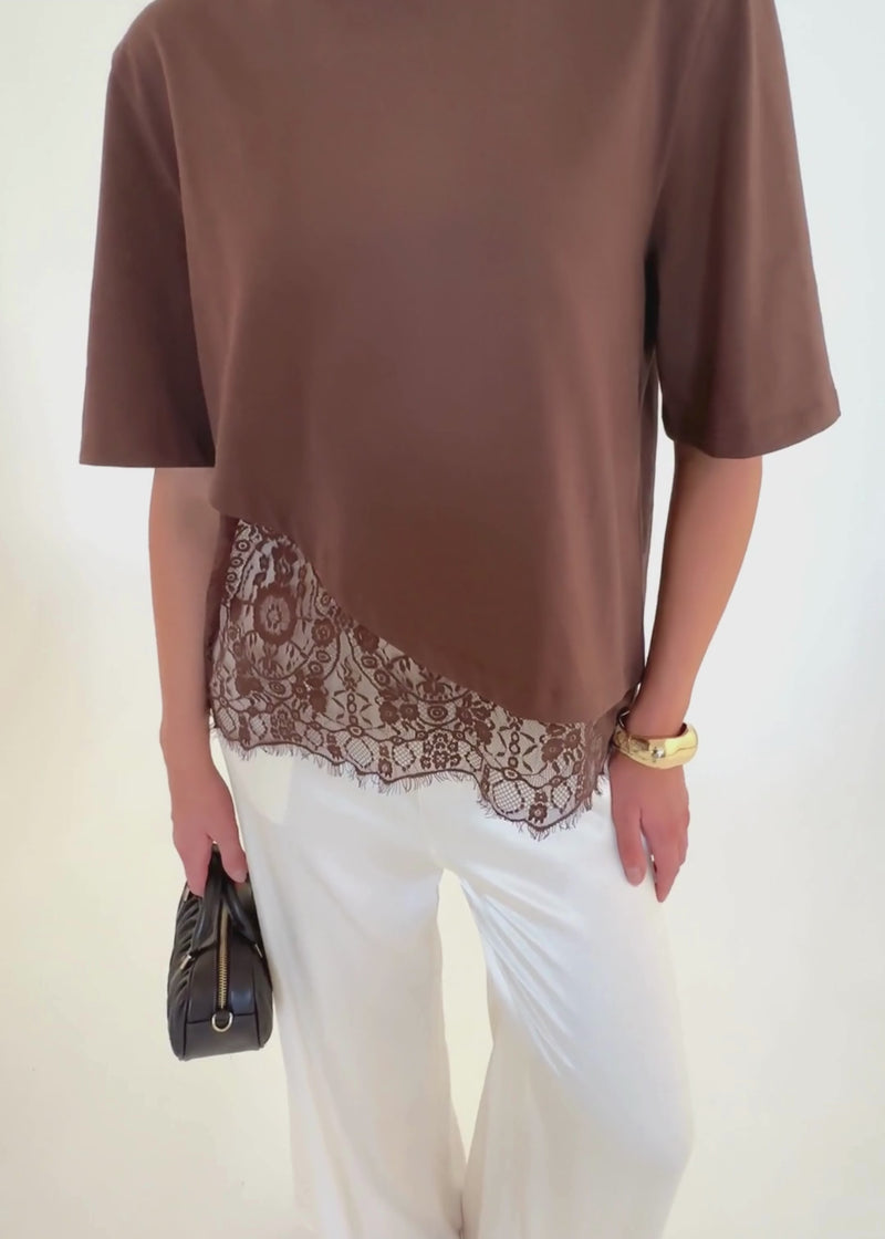 Soft and feminine, the Lolana Lace Splice Top – Chocolate pairs perfectly with denim, tailored pants, or skirts for day-to-night wear. Ideal for dinners, brunches, or casual evenings. Tap to shop and add romantic texture to your everyday looks.