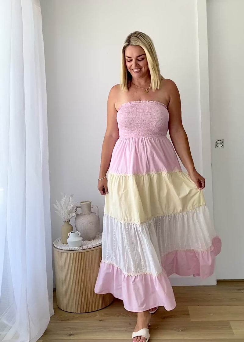 Step into vibrant energy with the Lucille Maxi Dress – Pink Splice.