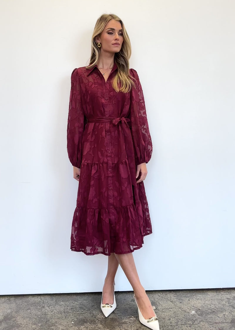 Turn heads in the Lucinda Maxi Dress in Burgundy. Its rich tone and flowing shape make it ideal for special occasions. Add gold jewellery, a clutch, and soft curls to elevate the look.