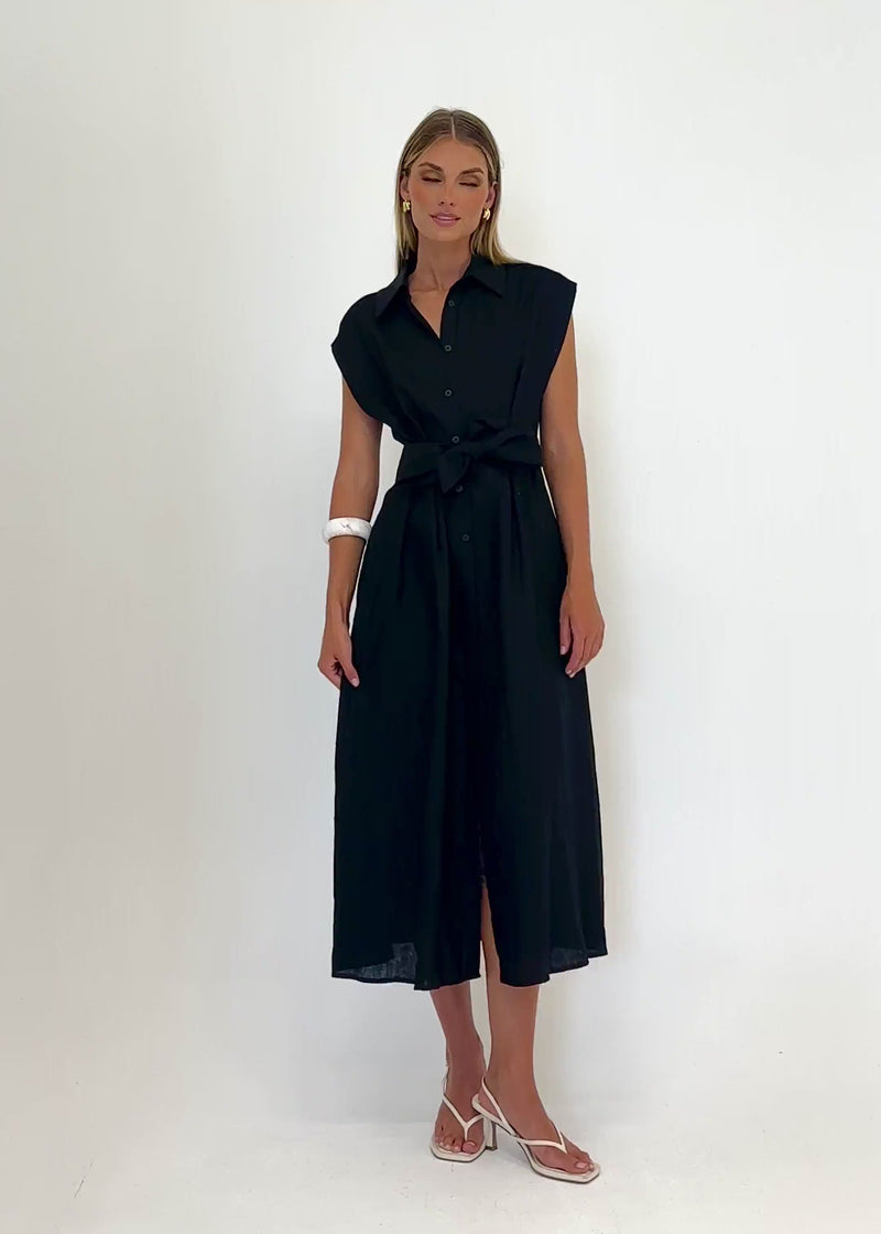 Easy, timeless, and endlessly wearable, the Makari Linen Midi Dress – Black is perfect for workdays, long lunches, or evening plans. Style with sandals for daytime or heels and gold jewellery after dark.