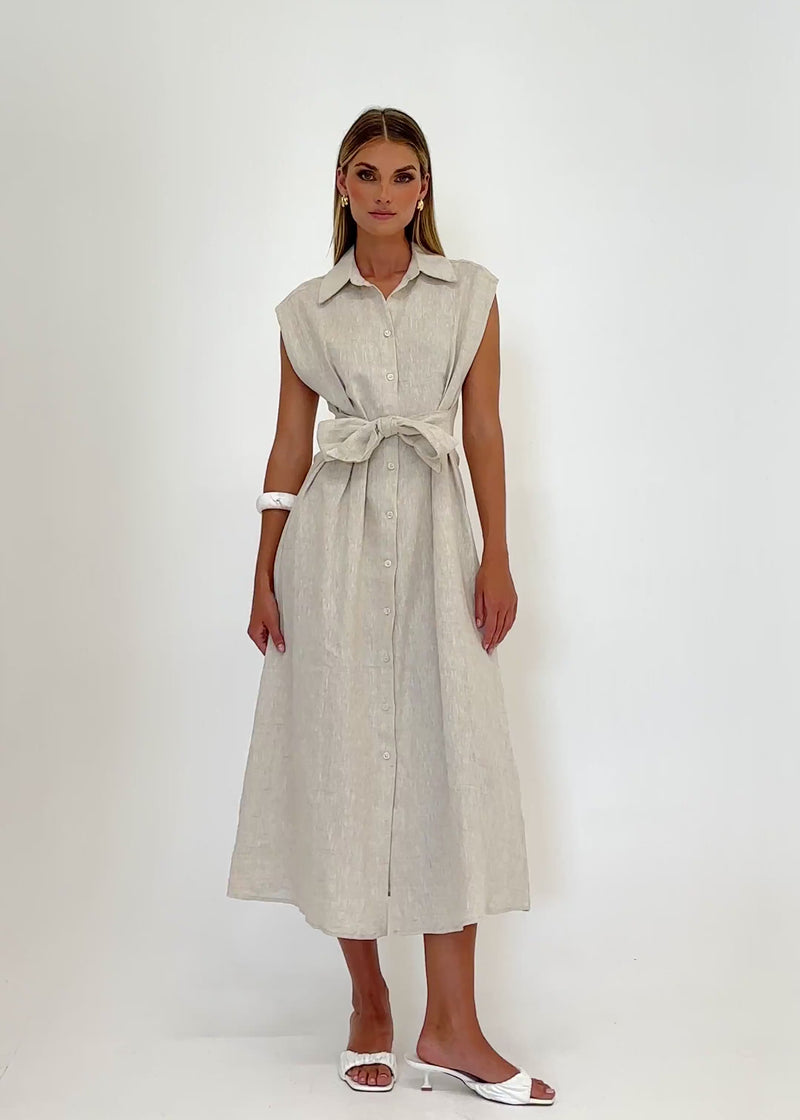 Neutral and timeless, the Makari Linen Midi Dress – Oatmeal works for workdays, long lunches, or weekend plans. Style with tan sandals and gold jewellery, or dress it up with heels.