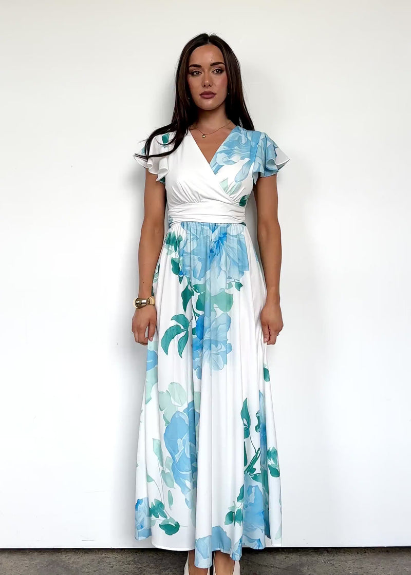 Flourish in every setting with the Marcella Maxi Dress in blue flowers.