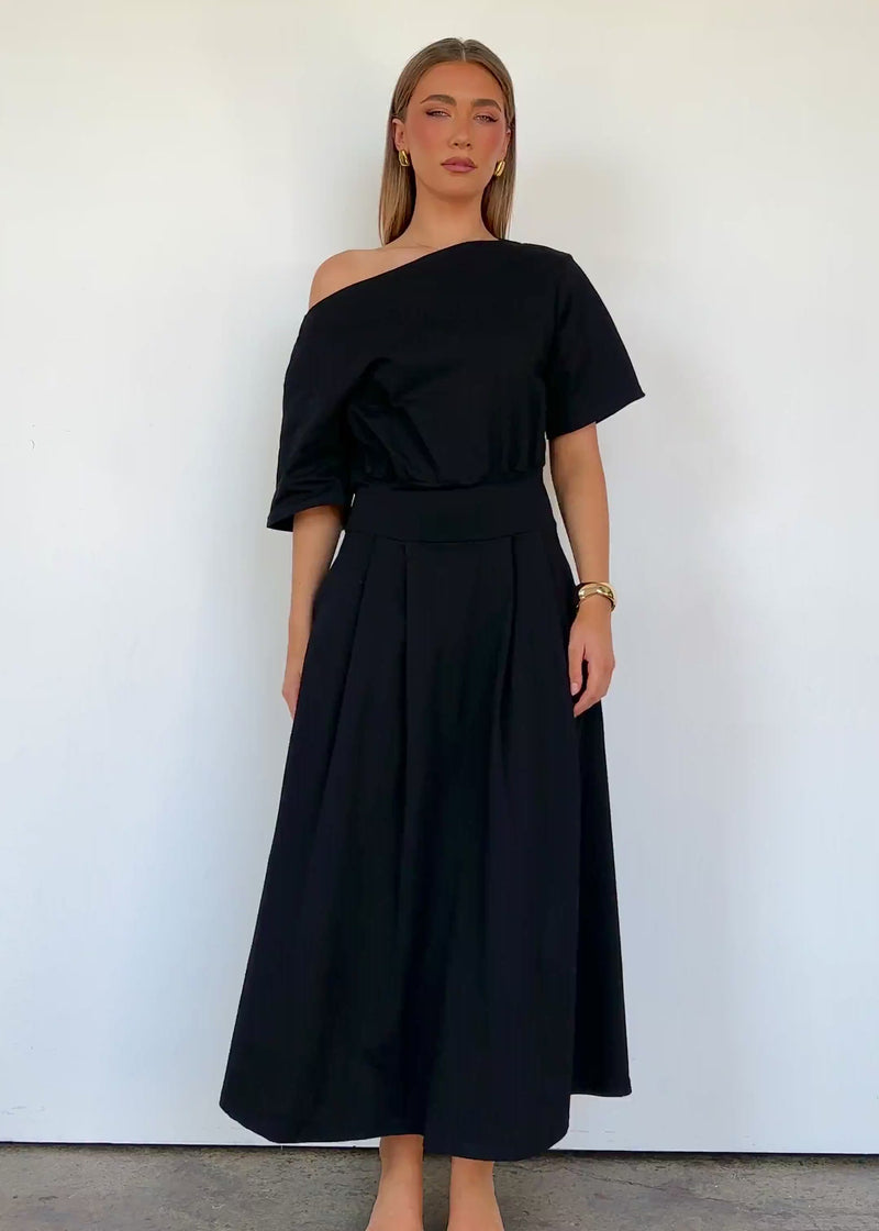 Go from day to night with ease in the Marcy Drop Shoulder Maxi Dress – Black. Perfect for dinners, city strolls, or weekend events, pair with strappy heels or flats and a statement clutch.