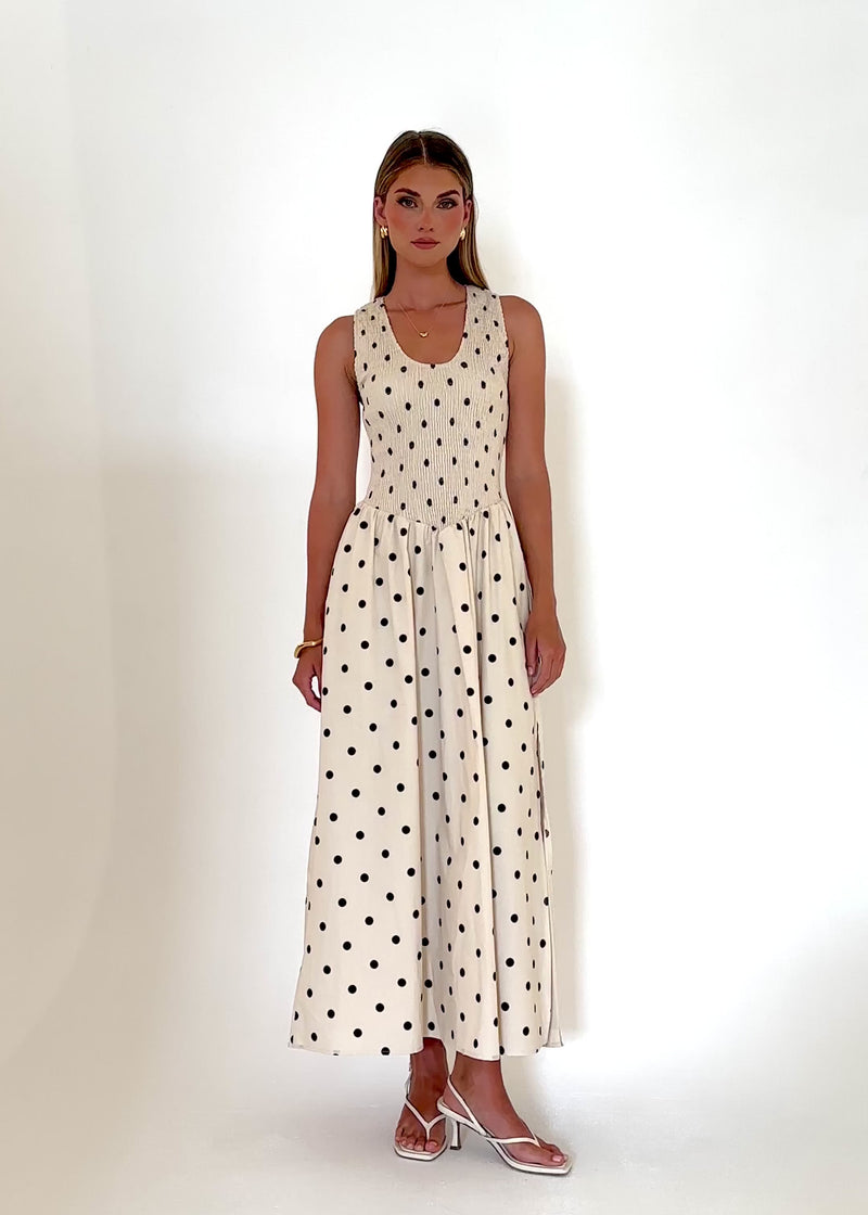 Radiate vintage charm wearing Marielle Maxi Dress - Beige Polka Dot to winery tours. Add neutral wedges and a wide-brim hat for a complete look. Stay cool during hot summer days while remaining effortlessly chic. You will enjoy a playful print for afternoon garden parties. A dress is a timeless wardrobe win.