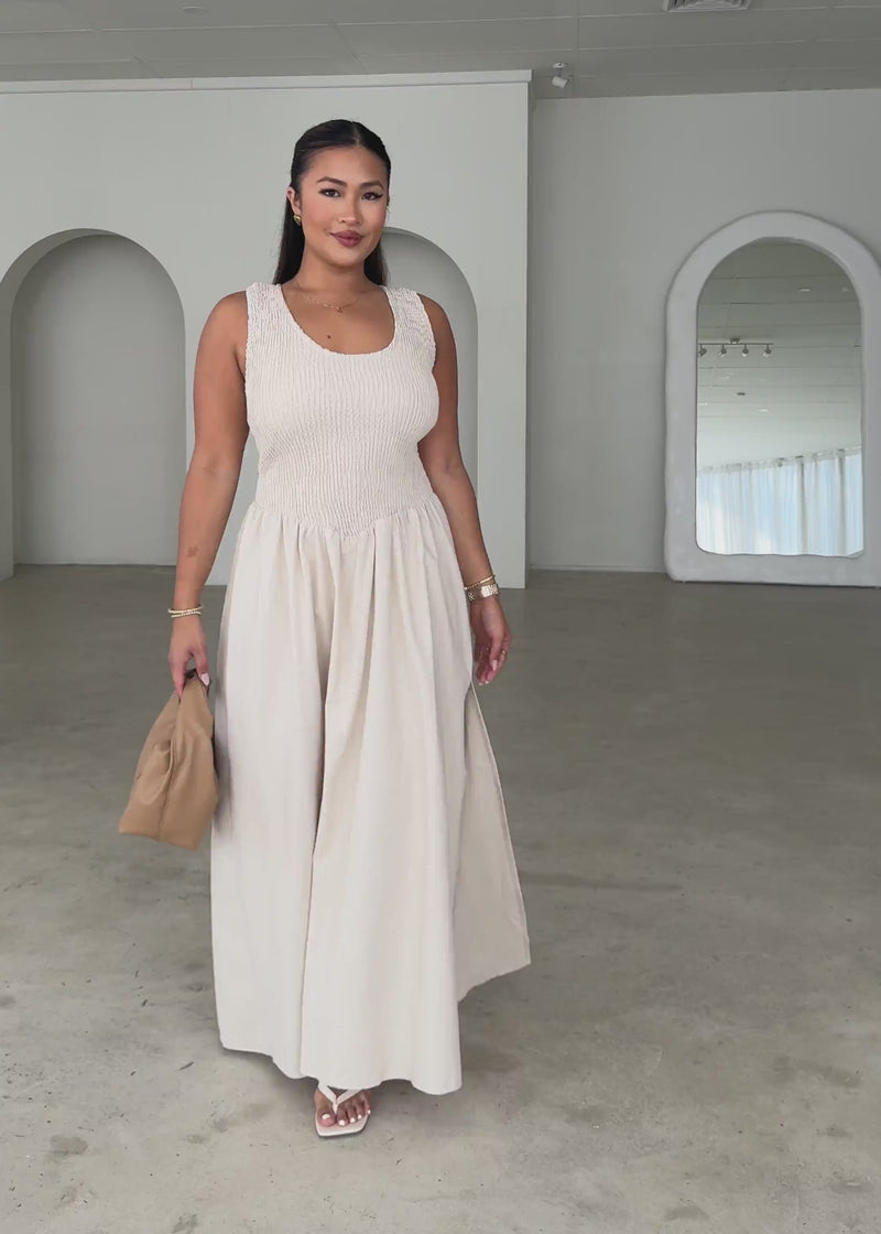 Effortlessly chic, the Marilee Maxi Dress – Beige suits dinners, relaxed celebrations, or elevated casual plans. Pair with nude heels, pearls, and a clean clutch.