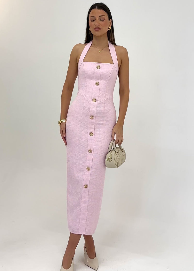 Soft and feminine, the Marina Halter Maxi Dress - Baby Pink is perfect for weddings, garden parties or romantic dinners. Pair with strappy heels and dainty jewellery, or keep it casual with sandals and a woven bag.