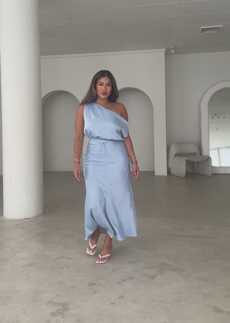 The Marisa Drop Shoulder Midi Dress in blue nails that easy elegance vibe with its flowy cut and off-shoulder detail. Pair with block heels and a clutch for weekend soirées.
