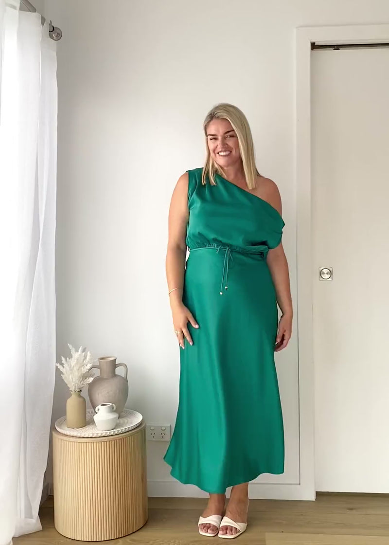 Turn heads in the Marisa Drop Shoulder Midi Dress in emerald — bold, graceful, and totally statement-making. Style it with nude heels and simple earrings for a refined finish.