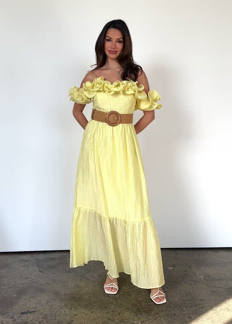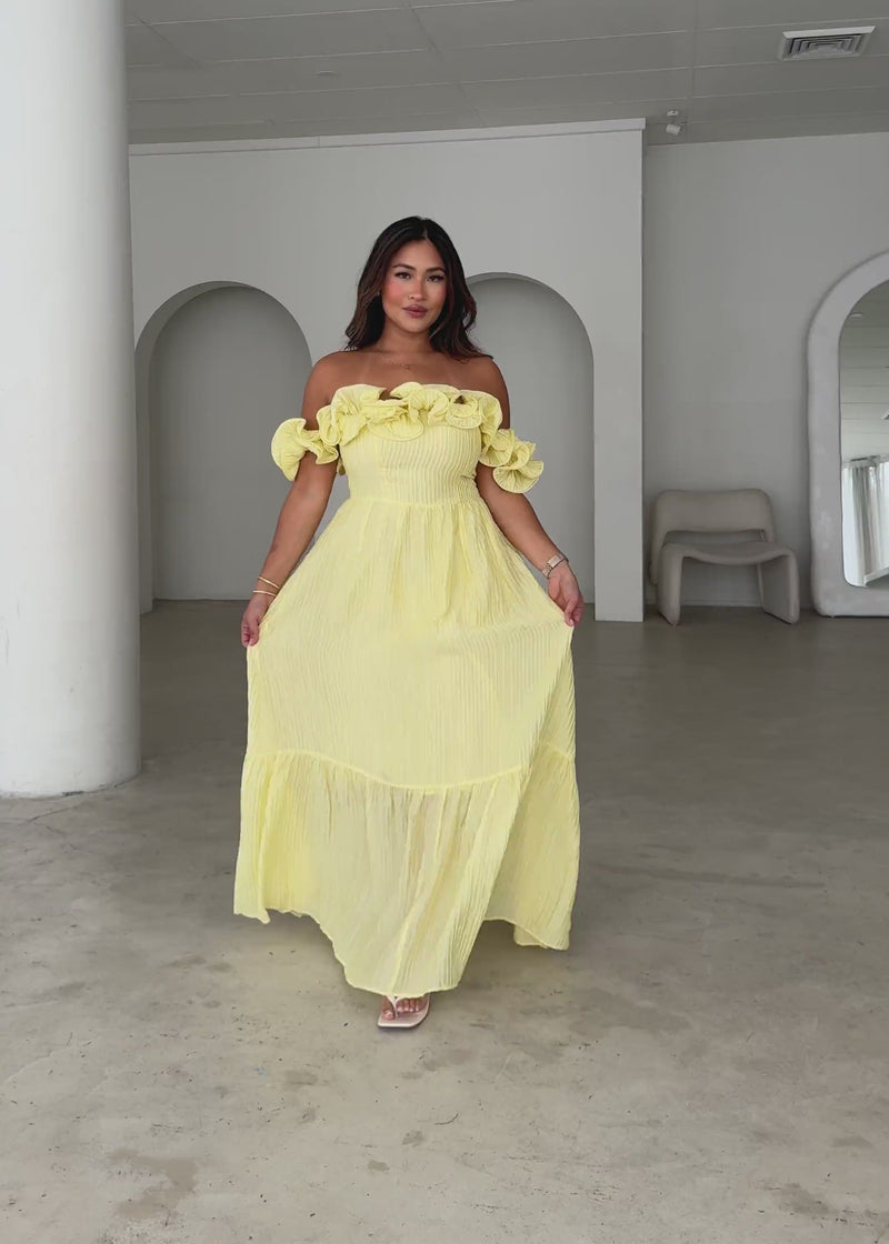 Bright, breezy, and unapologetically fun — the Marlow Maxi in lemon is sunshine in dress form. Pair it with nude heels and hoop earrings for a brunch or event look that pops.