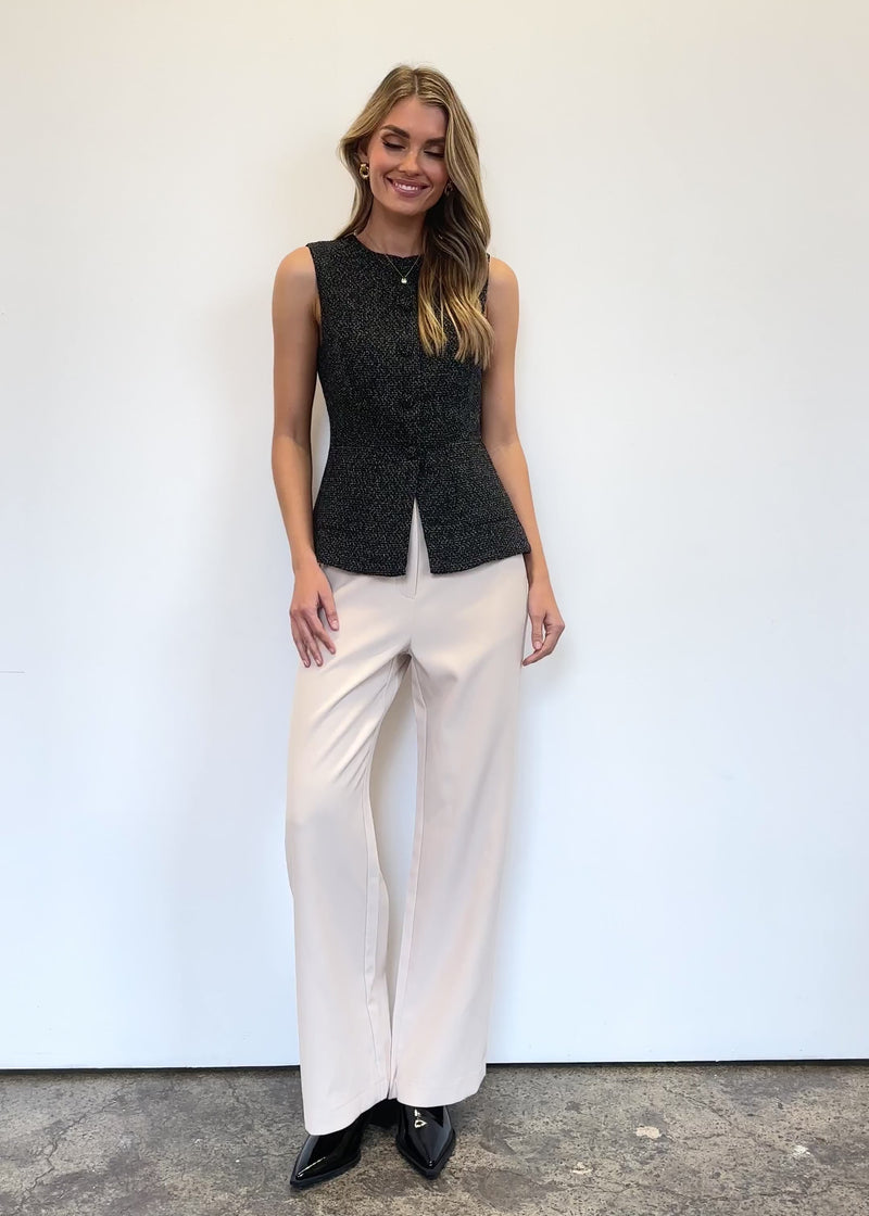 The Minnie Vest in black marl is the layer you’ll reach for again and again. Pair it with high-waist jeans and an open shirt or go sleek with a satin skirt and heels. Great for under blazers or cardis too.