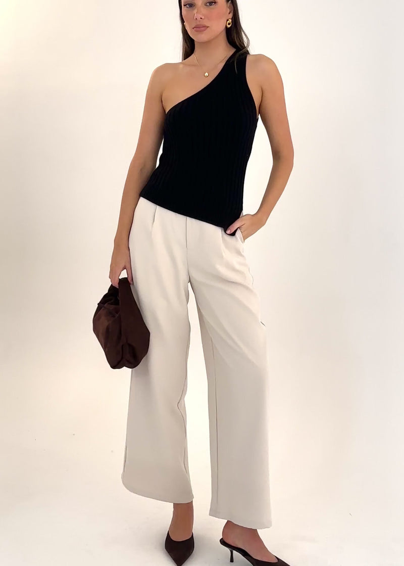 Refresh your essentials with the Natalee One Shoulder Knit Top in Black. Designed with a sleek one-shoulder silhouette and crafted from a comfortable knit fabric, this top offers both style and versatility. Team it with tailored trousers and loafers for a refined office ensemble, or wear it with distressed denim and ankle boots for a chic weekend outfit.