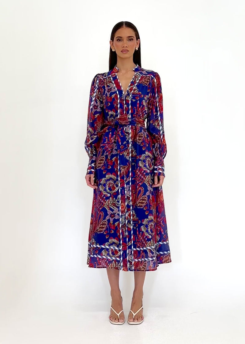 Bold blue native prints bring energy to this midi silhouette. Style with sandals or heels for versatile wear. Nateese Midi Dress offers comfort with standout style.