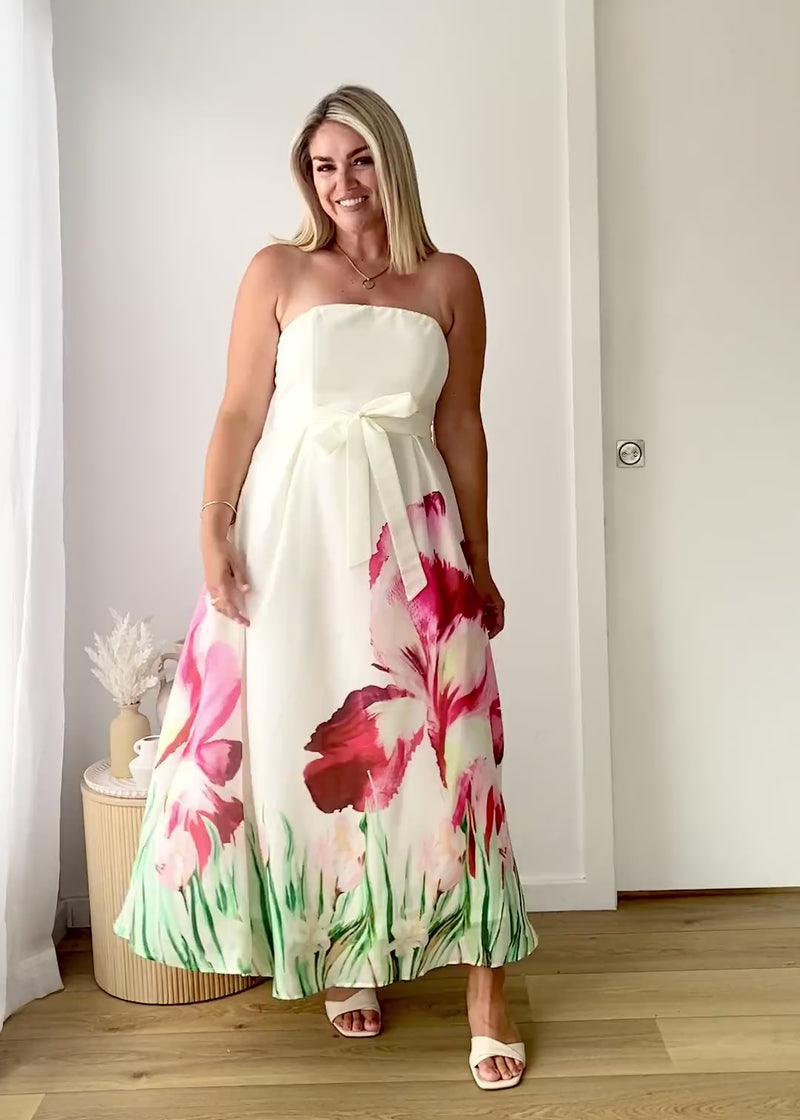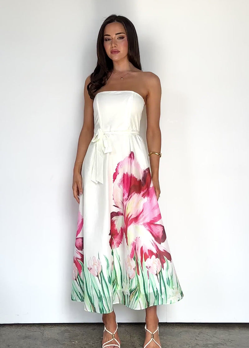 Make chic and casual meet in the Naya Strapless Midi Dress in ivory floral.