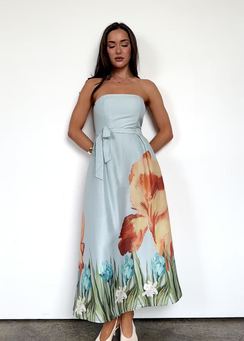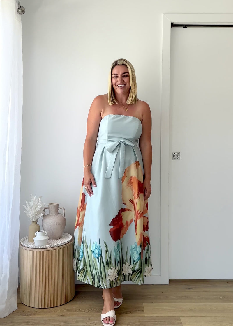Turn heads at every sunset moment with the Naya Strapless Midi Dress in sky floral.