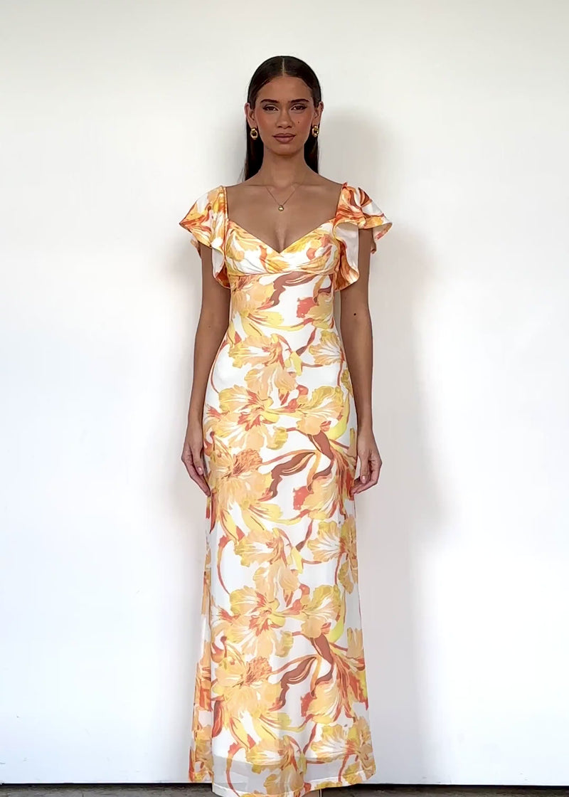 Brighten up your day with the Neiko Mesh Maxi Dress in Yellow Flowers. Its soft ruffle sleeves and flattering silhouette make it perfect for brunches, garden parties, or destination weddings. Pair with strappy sandals, pearl accessories, and a woven bag for that sunkissed vibe.