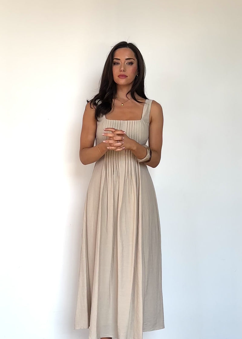 Effortless and refined, the Neishia Midi Dress - Beige is perfect with strappy sandals and a woven bag for daytime or heels and statement earrings for a polished night look. A versatile staple that works across seasons.