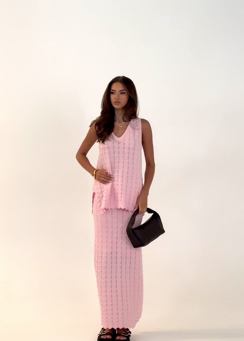 The Nerida Knit Top - Pink pairs perfectly with the matching knit maxi skirt for a coordinated look or with high-waist trousers for casual polish. Light, versatile, and ideal for day-to-night styling.