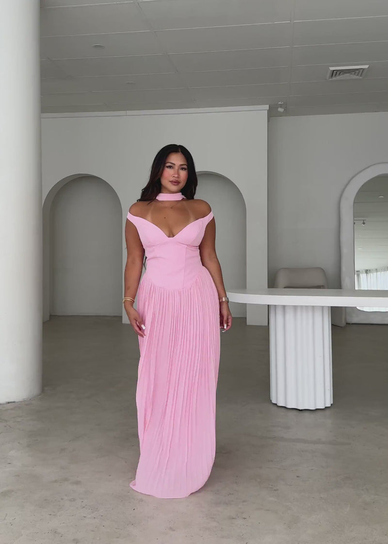 Soft and feminine, the Niah Off Shoulder Maxi Dress in pink is perfect for romantic dinners or daytime celebrations. Style with pastel heels, a beaded bag, and layered gold chains for extra charm.
