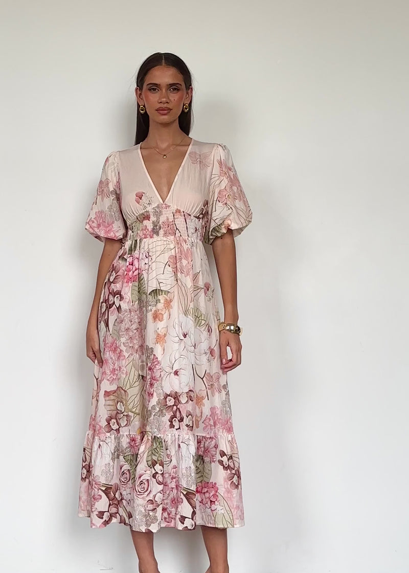 Float through warm days in the Nialla Maxi Dress in botanical blush, showcasing soft florals and graceful drape. Perfect for garden parties, relaxed afternoons and holiday escapes.