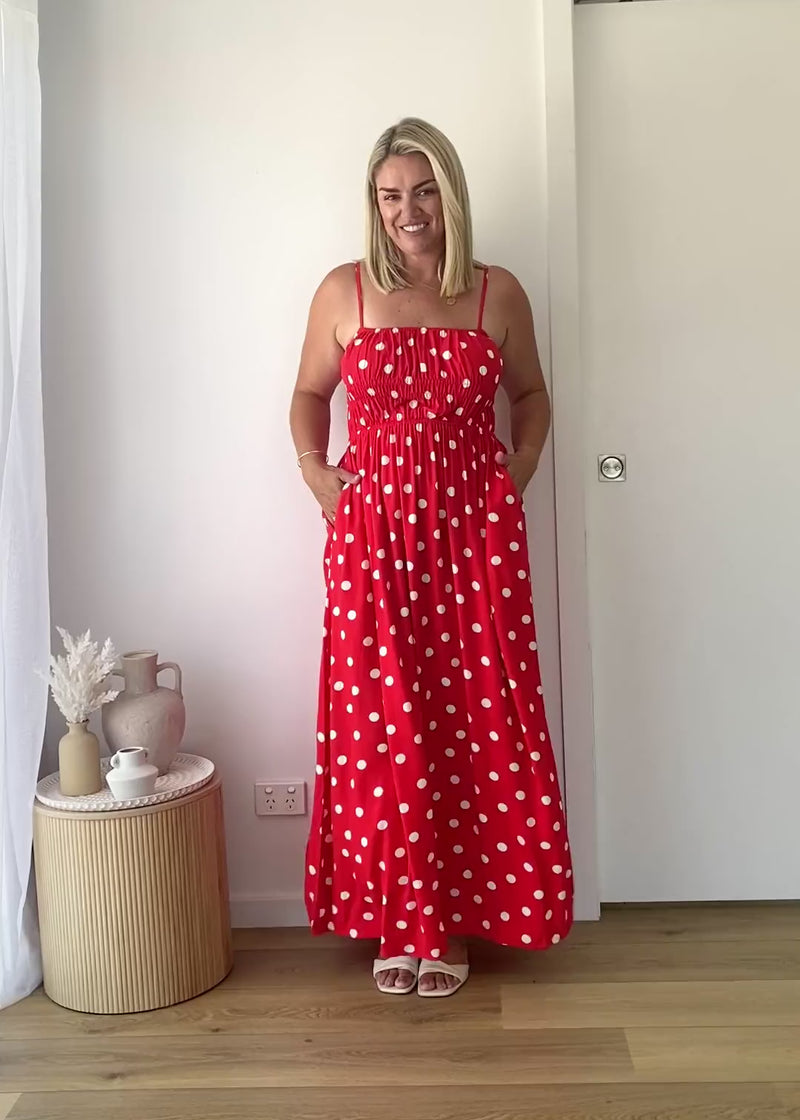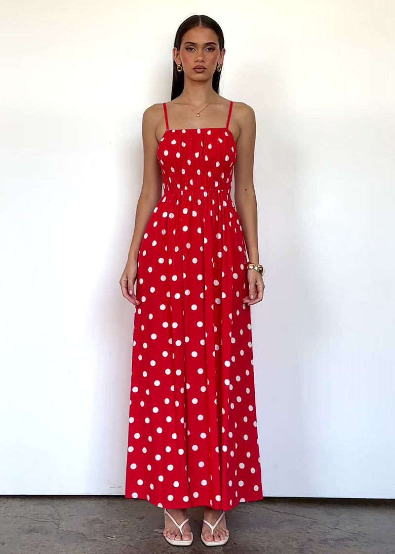Retro meets modern in the Nina Maxi Dress - Red Polka. Perfect for brunches or garden parties, it pairs beautifully with white sandals, cat-eye sunnies, and a red lip.