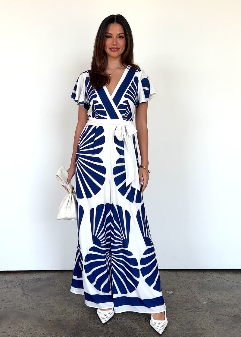The navy leaf Pascha Pantsuit gives off confident, cool-girl energy. Its flowy fit and leafy pattern make it easy to dress up or down. Style it with neutral mules and layered necklaces for an effortlessly put-together look.