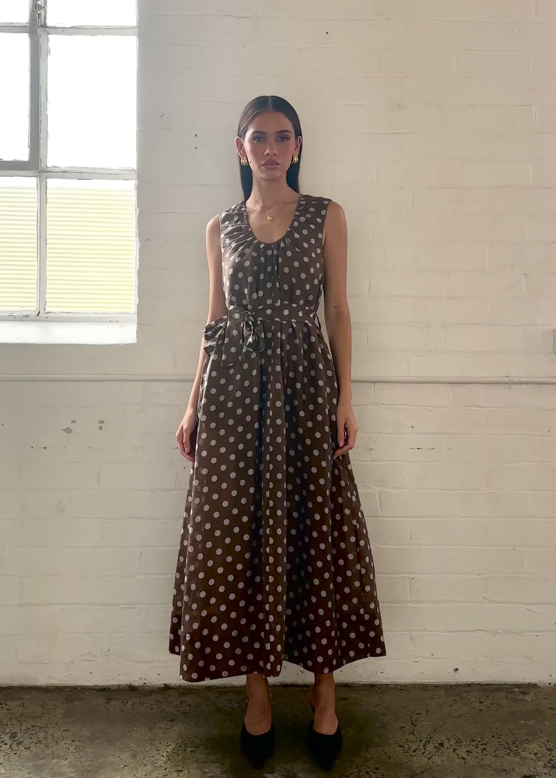 Fun meets sophistication with the Poppi Maxi Dress in chocolate polka. Pair it with strappy sandals and a raffia tote for daytime chic, or add heels and a clutch for night plans that call for playful polish.