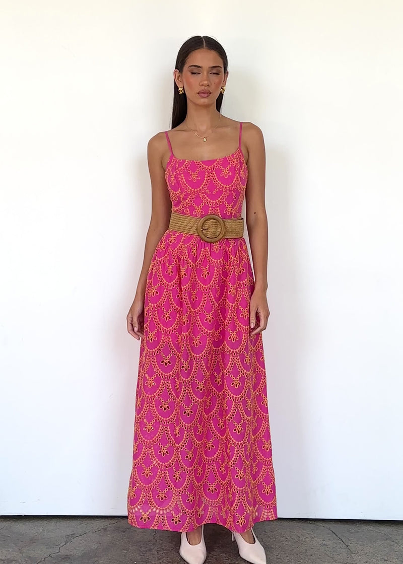 Romantic vibes only in the Purila Maxi Dress. With its pink embroidered details and flattering silhouette, it’s made for brunches or beach weddings. Pair with nude sandals and a mini bag.