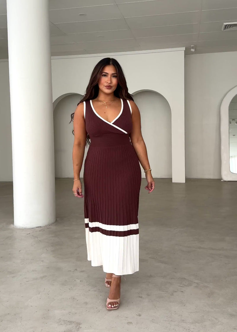Embrace rich tones with the Radiate Knit Midi Dress in Chocolate. Wear it with knee-high boots, a sleek low bun, and gold statement earrings for a luxe, put-together look. Layer with a tailored coat for cooler days.