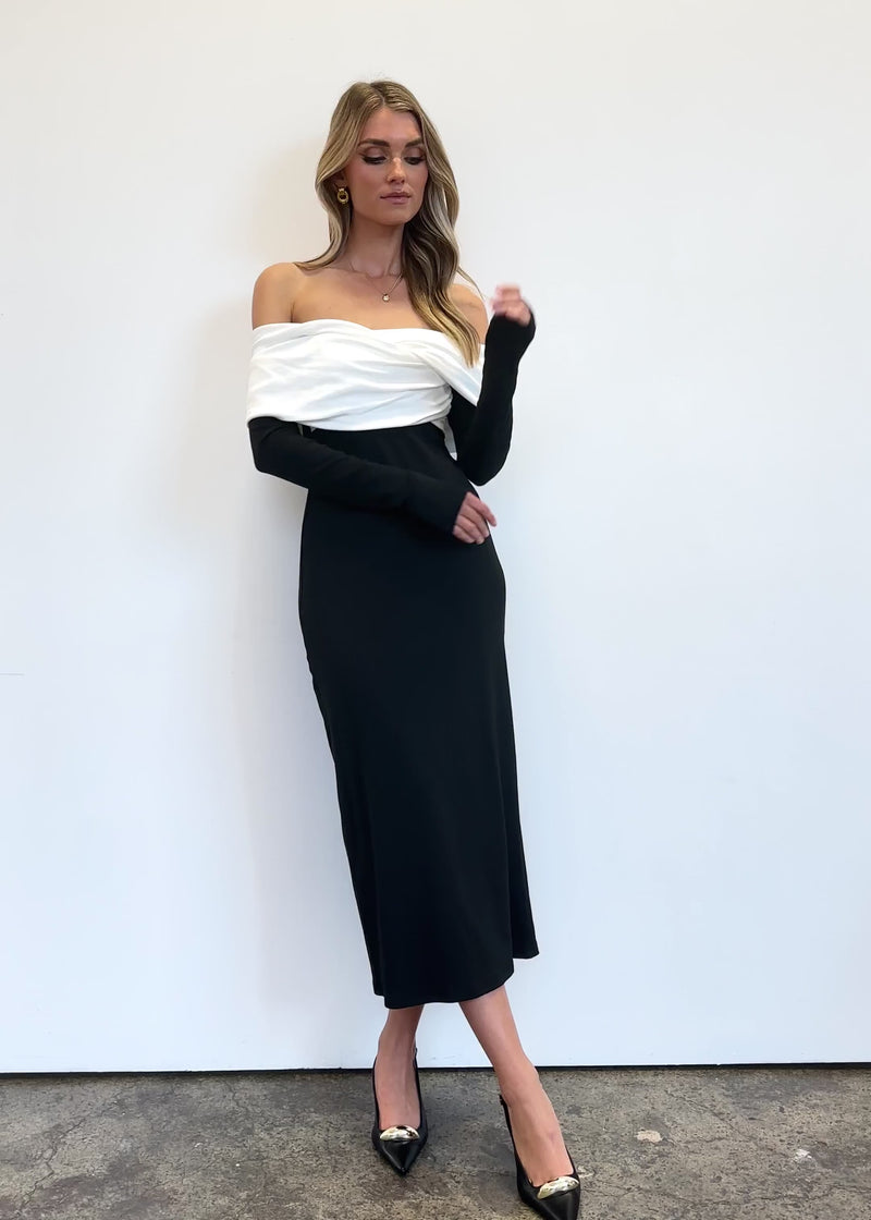 Turn heads in the Revolver Off Shoulder Maxi Dress in Black Splice. Designed with a striking contrast detail and an off-shoulder neckline, this maxi dress exudes confidence and elegance. Complete the look with sleek heels and a bold lip for an unforgettable outfit.