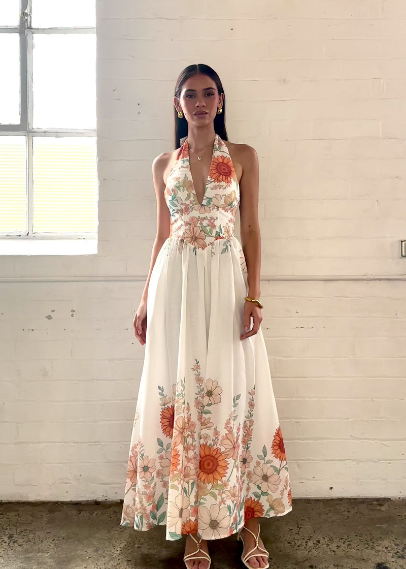 With its striking neckline, the Ricky Halter Maxi Dress makes a statement without trying. Wear it with bold earrings and espadrilles for cocktails, or with simple slides for daytime cool.
