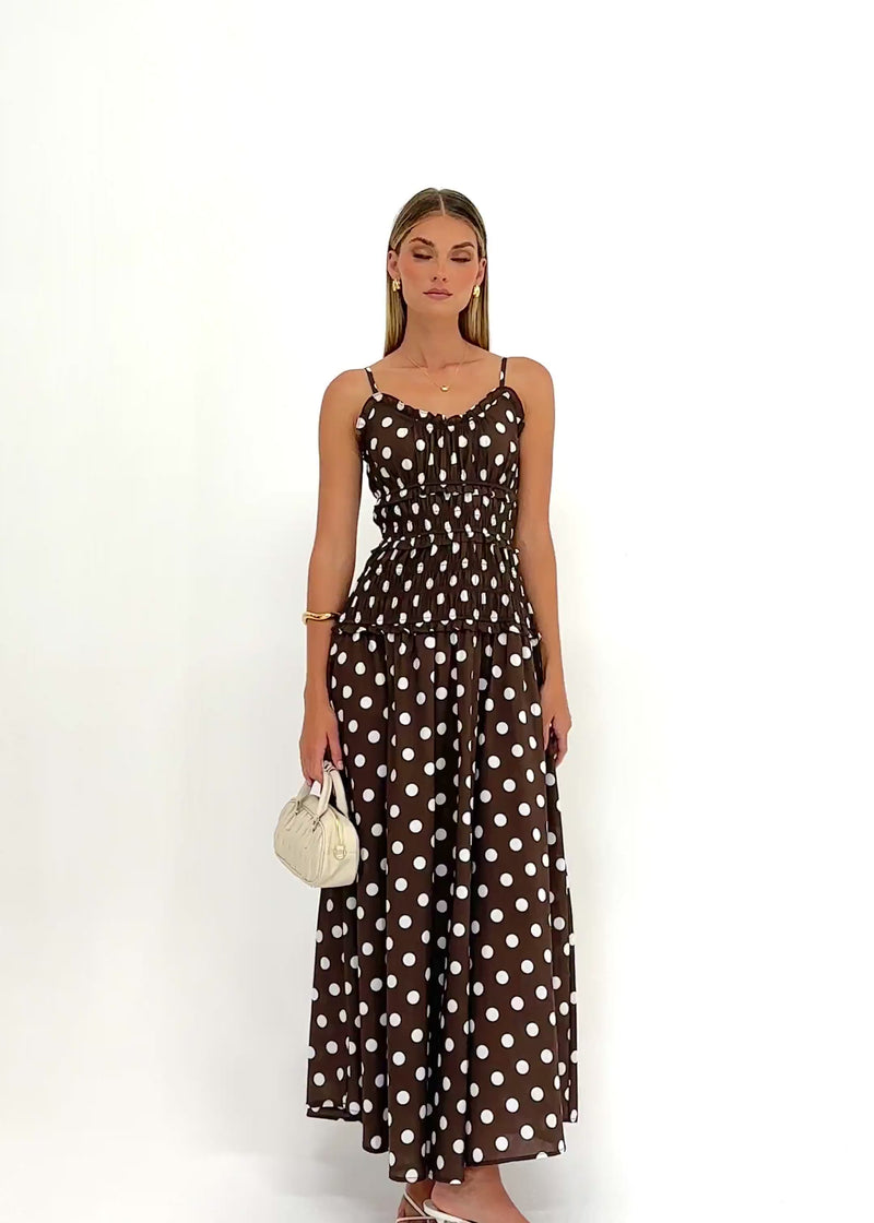 Radiate vintage charm wearing Rihana Maxi Dress - Chocolate Polka for winery tours. Add neutral wedges and a wide-brim hat for a complete look. Stay cool during hot summer days while remaining effortlessly chic. You will enjoy a playful print for afternoon garden parties. A dress is a timeless wardrobe win.