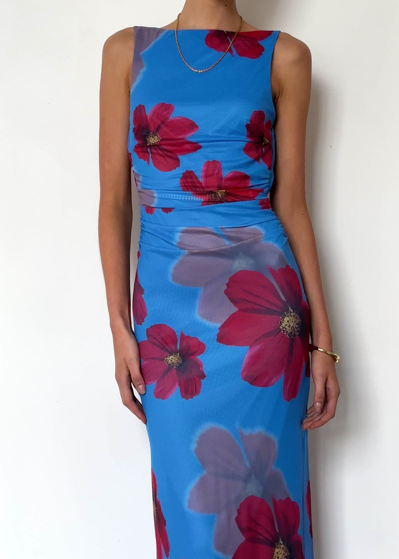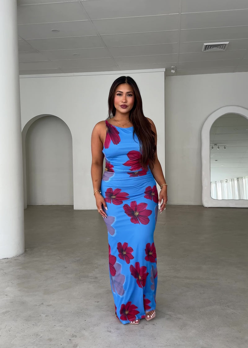 Feminine with a modern edge. The Rivka Mesh Maxi Dress in Blue Floral combines soft florals with a sleek, sheer design. Whether you're heading to a special event or a sunset dinner, this dress is guaranteed to turn heads. Style it with gold accessories and a bold lip for the perfect finish.