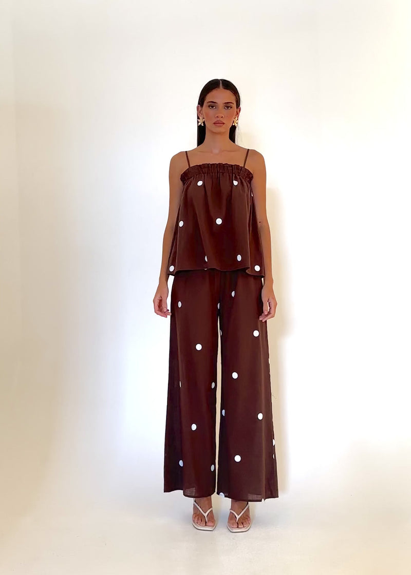 Playful yet polished, the Roberta Set in Chocolate Polka includes a top and skirt that work perfectly together. Wear with heels for events or mix with basics for versatile outfits.