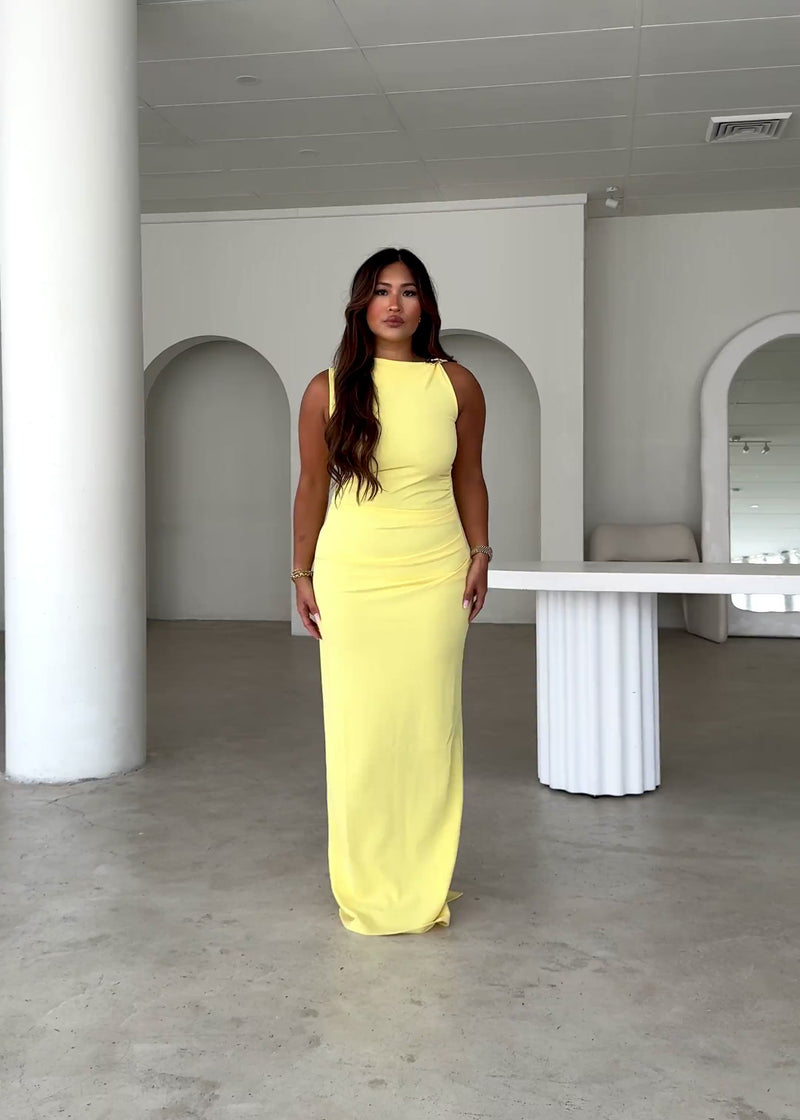 Brighten up your event wardrobe with the Rosita Dress in Lemon. Its clean, structured silhouette makes it perfect for formal occasions. Pair with white heels and pearl accessories for a fresh take.