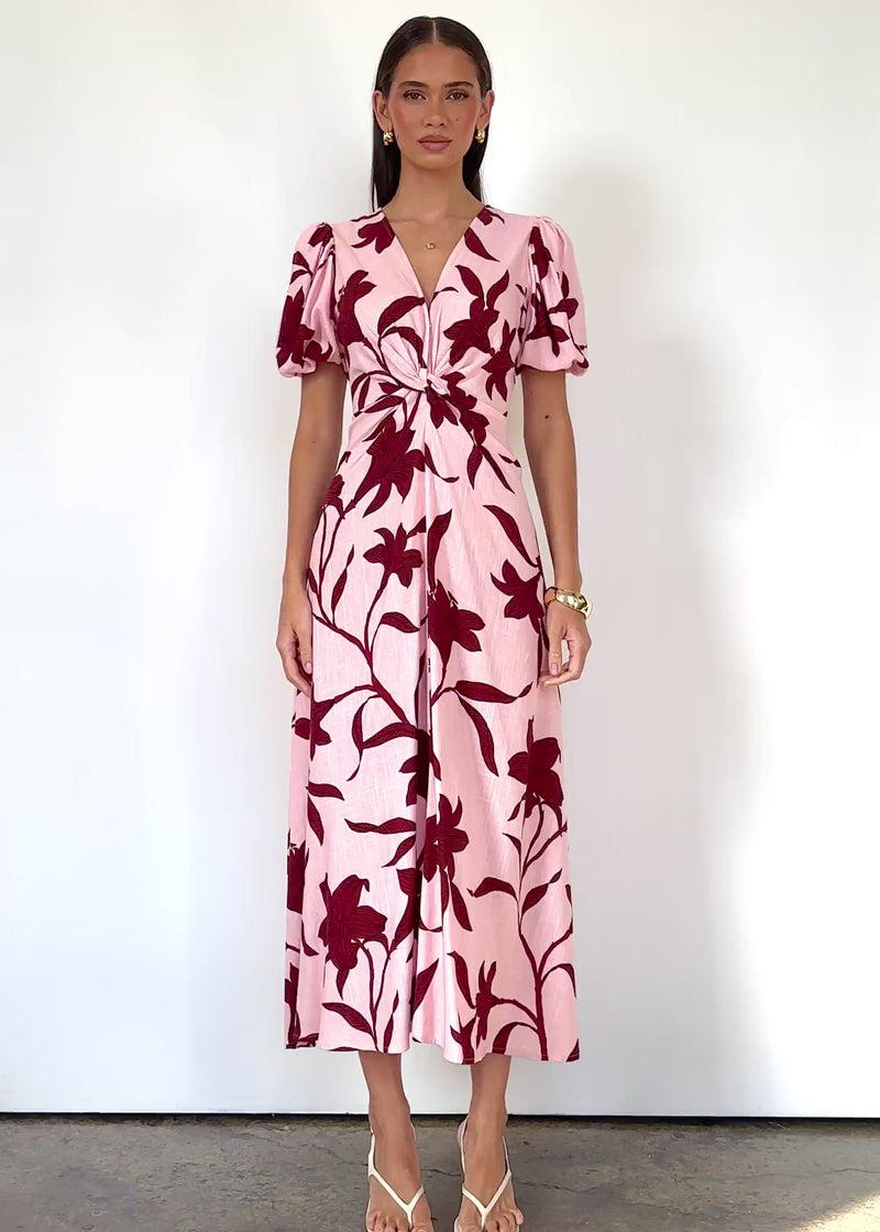 Sweet and elegant, the Sahara Midi Dress in Chloe Pink suits brunches, events, and weekend outings. Style with wedges and a woven bag or elevate with heels and jewellery for evenings.