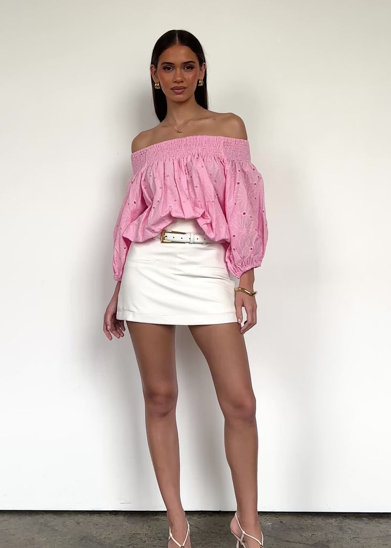 Bring playful energy with the Saidie Off Shoulder Top in Pastel Pink. Pair with high-waisted skirts or relaxed jeans and finish with chunky sandals.